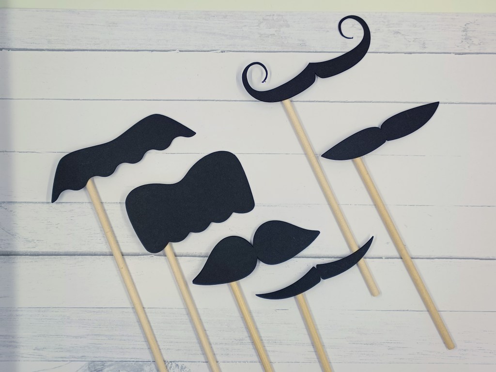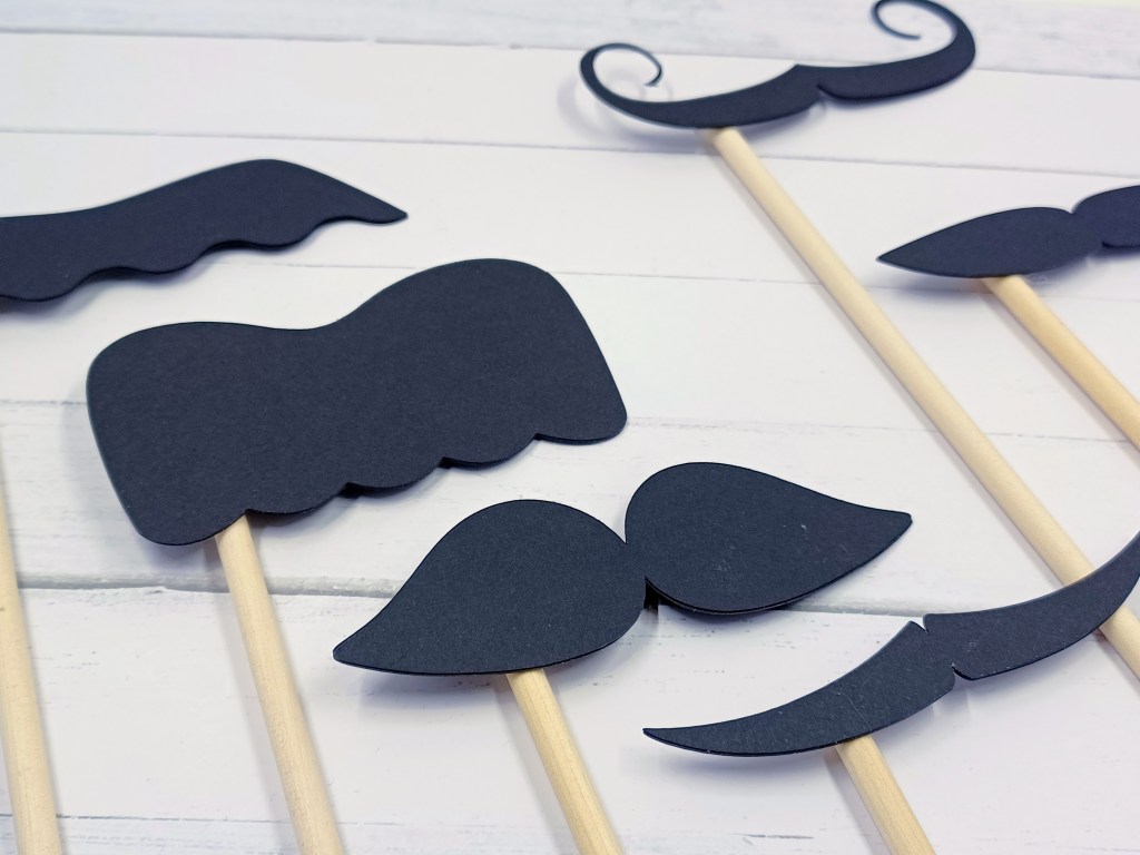 Pour les réaliser, j’ai utilisé ma cricut (je fais beaucoup de choses avec la cricut 😉) et le fichier en svg ci-dessous (que vous pouvez télécharger gratuitement). J’ai découpé dans du carton noir en trois exemplaires chaque moustache pour ensuite les coller ensemble (pour qu’elles soient plus solides). Il reste juste à coller un bâton à l’arrière avec de la colle chaude pour que cela tienne.